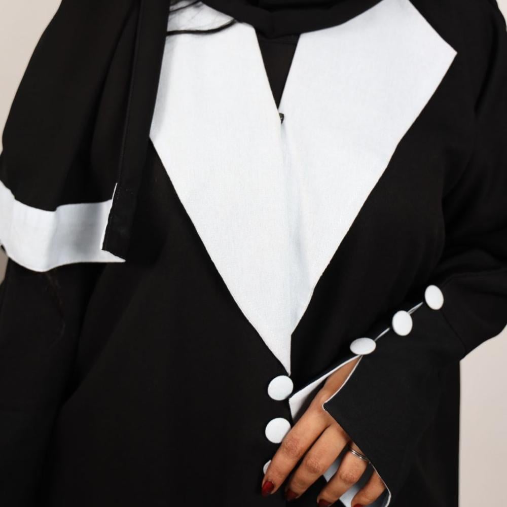 وصف المنتج : عباية بقماش الميني ميت بقصة مميزه من الاكمام وياقة بلون سماوي ناعم